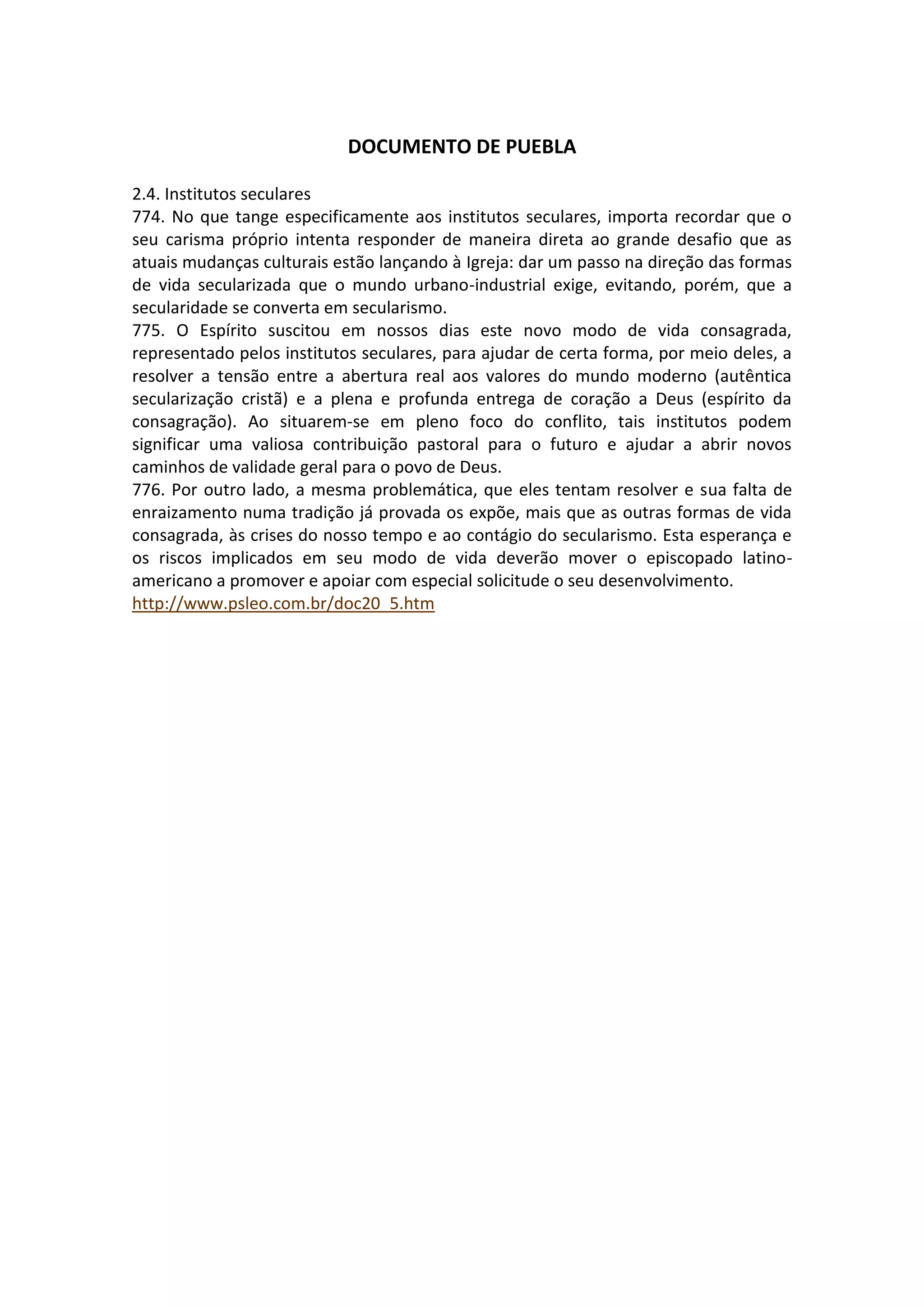 O documento discute institutos seculares, que tentam responder ao desafio de formas de vida secularizada no mundo moderno evitando o secularismo. Esses institutos ajudam a resolver a tensão entre abertura aos valores modernos e total dedicação a Deus. Eles podem contribuir pastoralmente no futuro, mas também estão mais expostos a crises devido à falta de enraizamento em tradições. Os bispos devem apoiar seu desenvolvimento com cuidado dado os riscos e esperanças desse modo de vida.