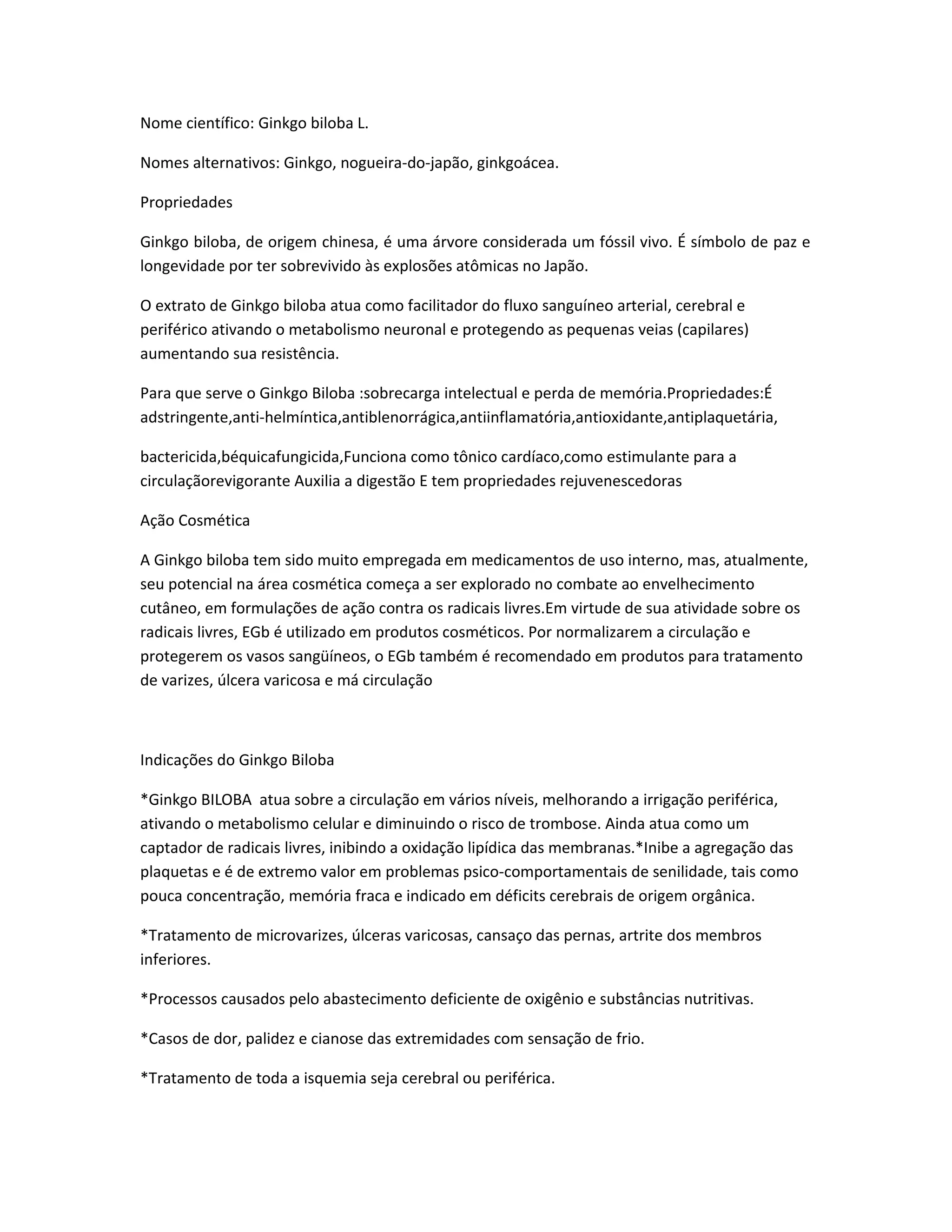 O documento descreve as propriedades e usos da planta Ginkgo biloba. Ela é uma árvore considerada um fóssil vivo nativa da China, símbolo de paz e longevidade. Seu extrato atua melhorando o fluxo sanguíneo e protegendo os vasos sanguíneos. Ele é usado para problemas de memória, circulação, digestão e rejuvenescimento.