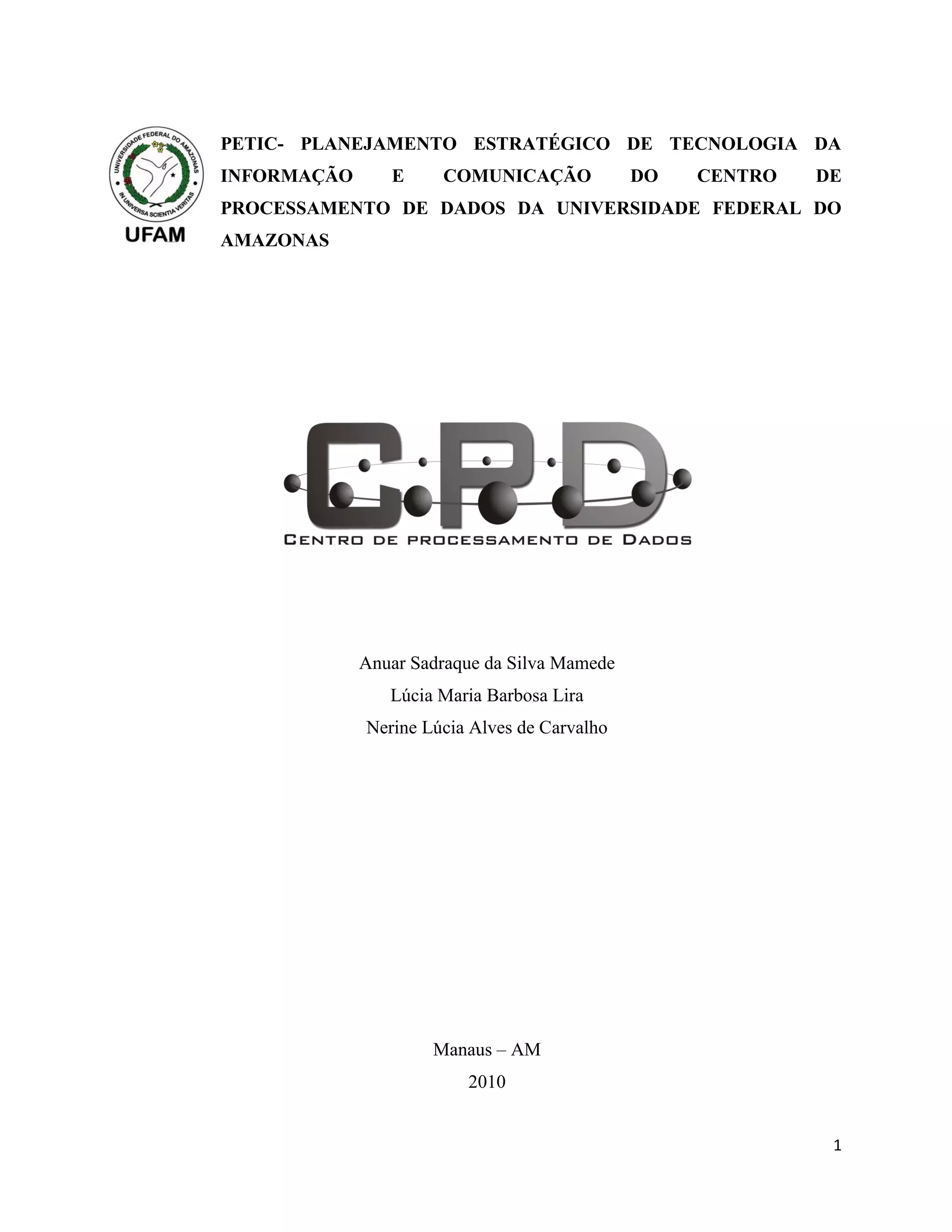 1) O documento descreve o Planejamento Estratégico de Tecnologia da Informação e Comunicação do Centro de Processamento de Dados da Universidade Federal do Amazonas. 2) Ele detalha a missão, visão, valores e objetivos organizacionais do CPD-UFAM. 3) Além disso, apresenta a estrutura organizacional do CPD, com suas gerências e atribuições, e como o PETIC será usado para planejar as atividades e recursos de TI.