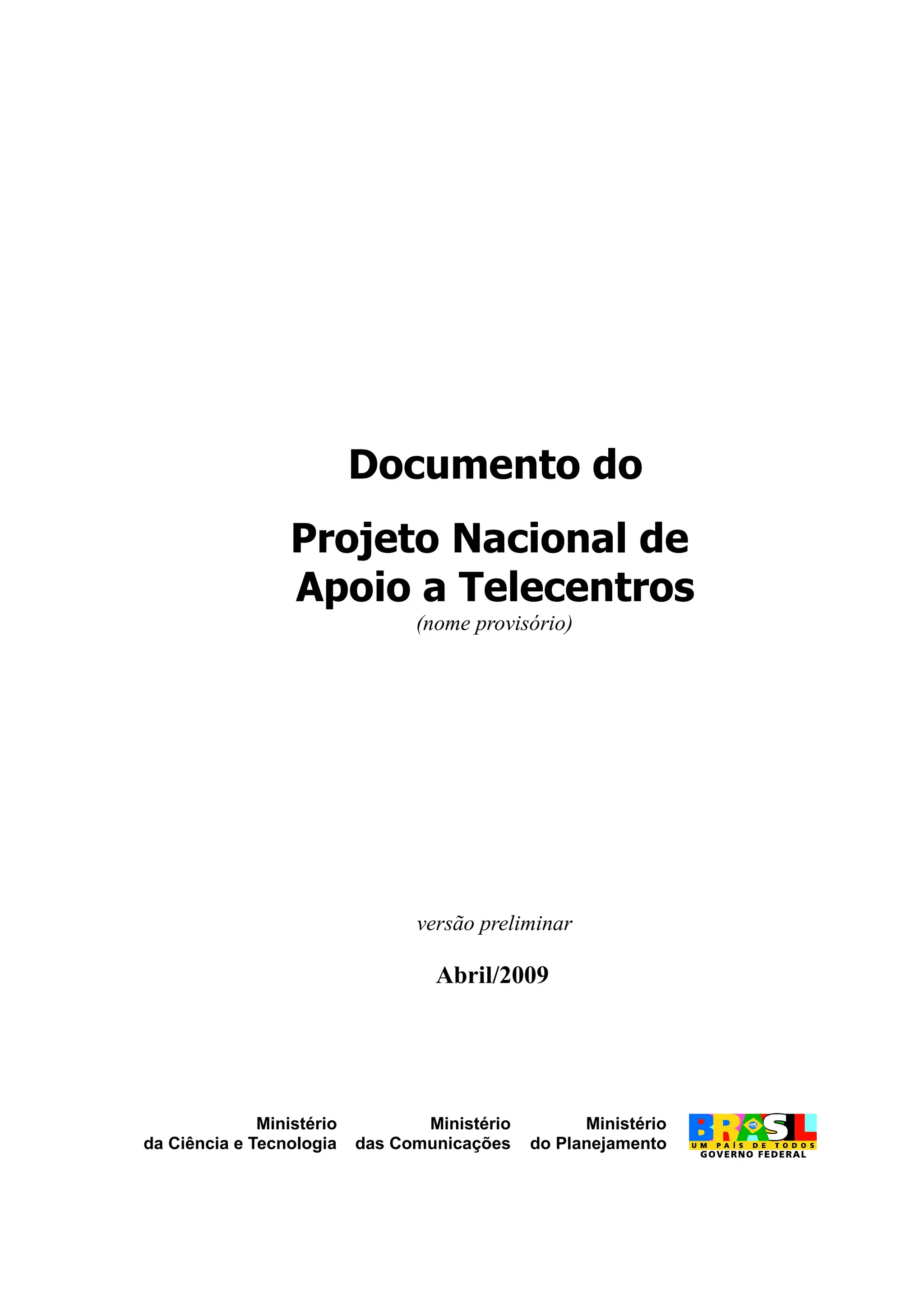 O documento propõe um Projeto Nacional de Apoio a Telecentros para promover a inclusão digital no Brasil. O projeto visa organizar a oferta e demanda por telecentros com critérios comuns, coordenar iniciativas de inclusão digital do governo federal e contribuir para a consolidação da política pública de inclusão digital. O apoio aos telecentros será por meio de equipamentos, conectividade à internet, bolsas para monitores e formação para monitores.