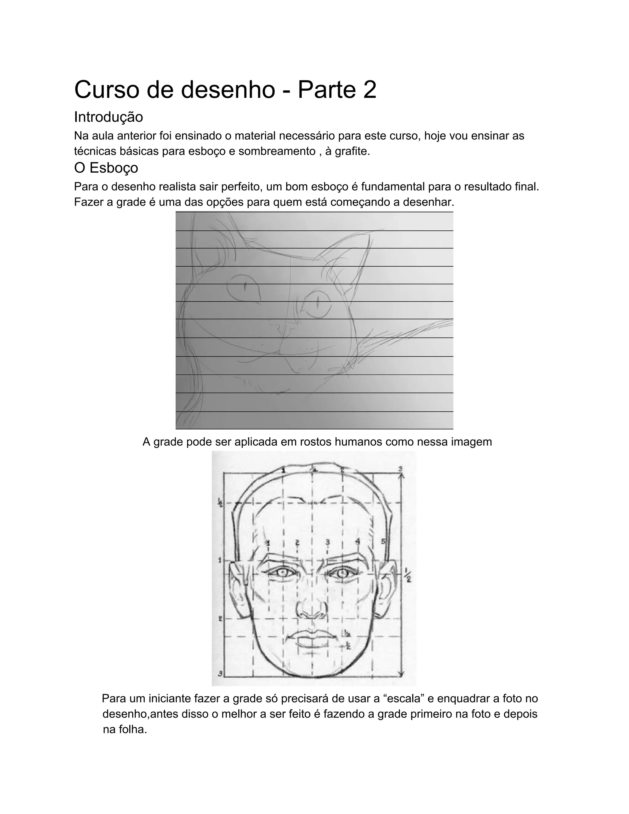 Este documento fornece instruções sobre técnicas básicas de esboço e sombreamento para desenho realista, incluindo o uso da grade para enquadrar o rosto, proporções do rosto e dicas sobre luz e sombra. É explicado que a sombra é resultado da luz incidindo em um objeto e que o esboço deve ser conciso antes de aplicar sombras mais claras ou escuras de acordo com a referência.