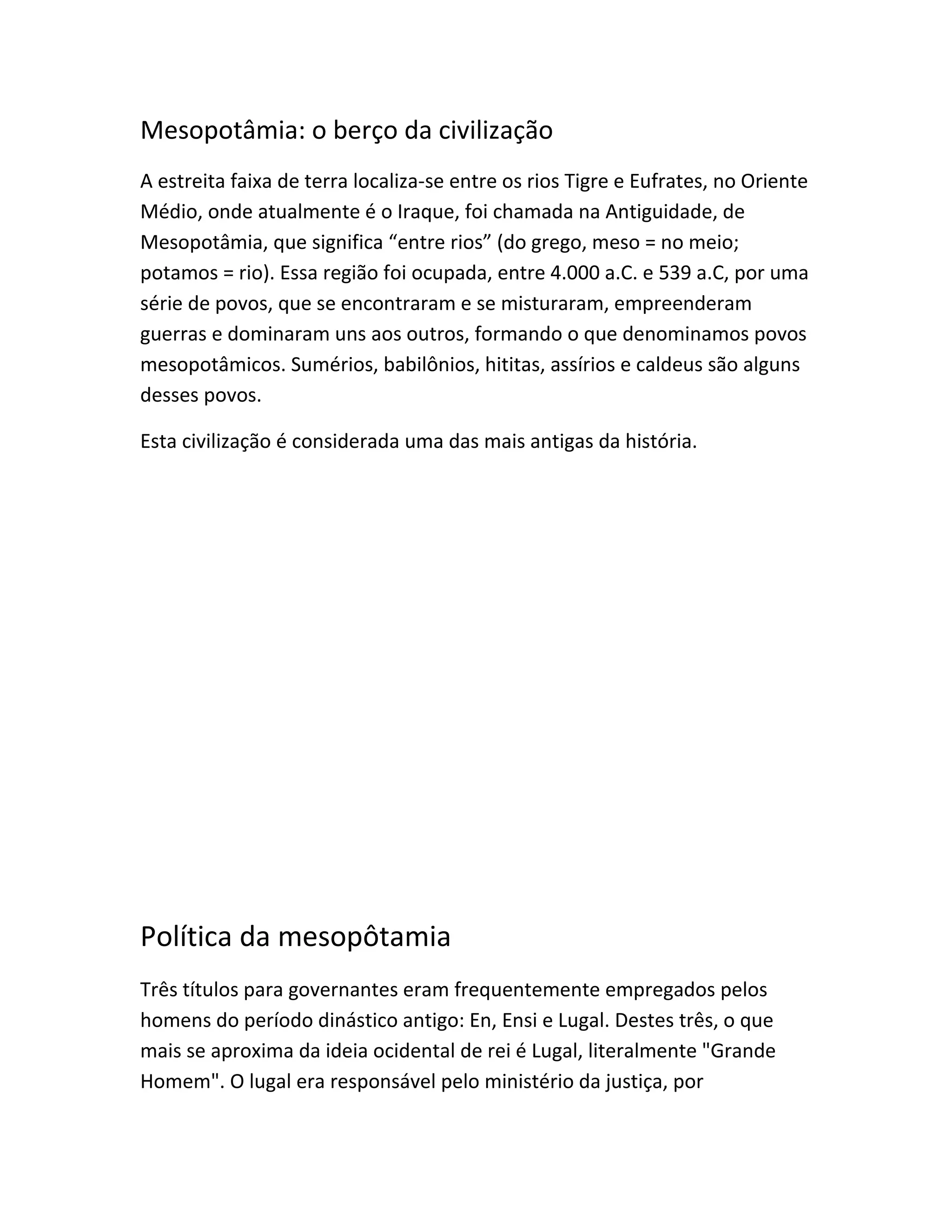 1) A Mesopotâmia foi o berço da primeira civilização entre os rios Tigre e Eufrates no Oriente Médio, onde vários povos se desenvolveram entre 4000 a.C. e 539 a.C.;