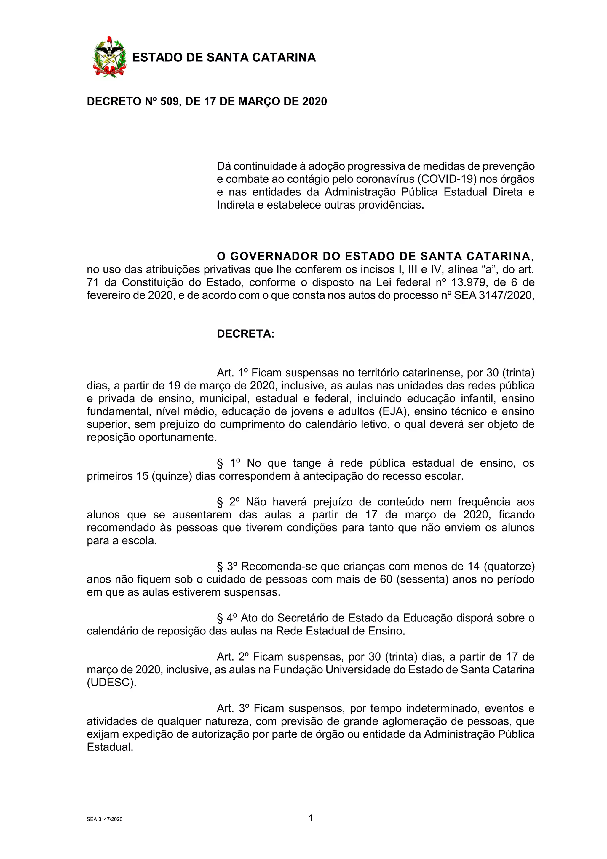 Este decreto do governo de Santa Catarina suspende as aulas nas redes pública e privada de ensino por 30 dias para combater a disseminação do coronavírus. Também suspende eventos com mais de 100 pessoas em locais fechados ou 200 em locais abertos, e recomenda que pessoas com mais de 60 anos restrinjam suas saídas às atividades essenciais. Além disso, estabelece regras para o trabalho remoto de servidores públicos.