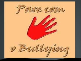 O documento discute o bullying, suas consequências negativas para as vítimas e como os agressores geralmente se comportam. O bullying ocorre não apenas nas escolas, mas também em locais públicos e até mesmo dentro de casa, causando danos psicológicos e físicos graves e permanentes para as vítimas, como falta de apetite, distúrbios de sono e agressividade. Os agressores, conhecidos como bullies, geralmente se aproveitam de seu tamanho e força para humilhar verbalmente e fisicamente aqueles que