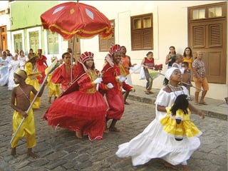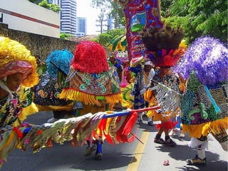 O documento descreve o Maracatu, uma dança folclórica de origem afro-brasileira típica de Pernambuco. Surgiu no século XVIII a partir da miscigenação cultural portuguesa, indígena e africana. Existem dois tipos principais: o Maracatu Rural e o Maracatu Nação. As danças ocorrem ao som de instrumentos como o tarol e zabumba e envolvem coreografias que representam personagens históricos.