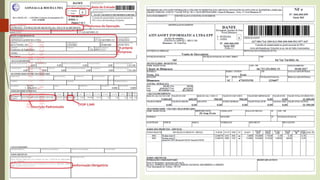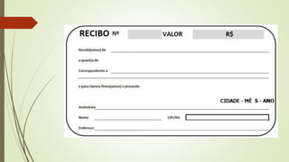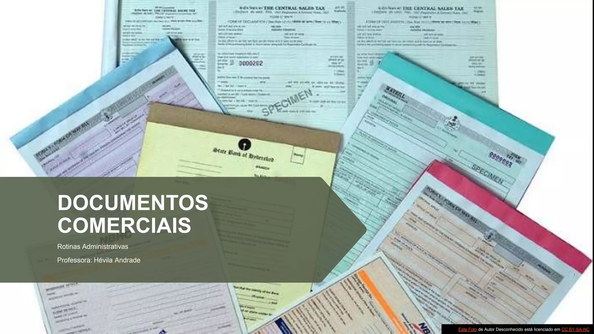 O documento discute vários tipos de documentos comerciais, incluindo cheques, notas promissórias, duplicatas, boletos, borderôs, recibos e notas fiscais. Explica o que cada um é, como preenchê-los corretamente e quais informações devem conter de acordo com a lei.