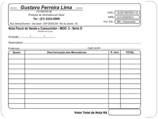 O documento discute os tipos de documentos fiscais que devem ser emitidos em transações envolvendo a circulação de mercadorias, incluindo cupons fiscais, notas fiscais modelo D ou D1, e notas fiscais eletrônicas. A nota fiscal eletrônica tem como objetivo substituir as notas fiscais em papel, reduzindo custos e simplificando obrigações para empresas e o governo.