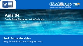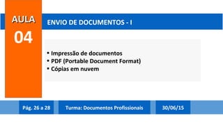 O documento discute produção de documentos profissionais, incluindo impressão de documentos, formato PDF, e cópias na nuvem. Ele fornece instruções sobre como salvar arquivos em formato PDF e compartilhar arquivos na nuvem usando serviços como Google Docs.