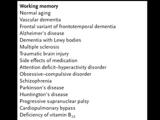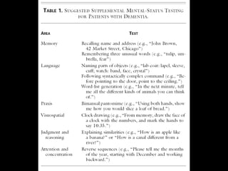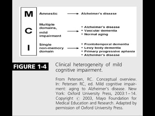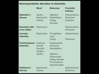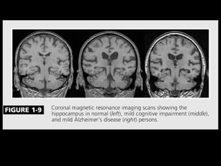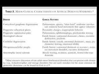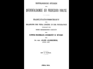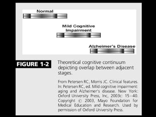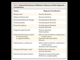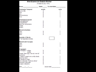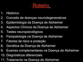 O documento aborda a doença de Alzheimer, incluindo sua história, epidemiologia, aspectos clínicos, diagnóstico, fatores de risco e tratamento. Destaca a importância dos testes neuropsicológicos e a fisiopatologia relacionada à doença, além de explicar a diferenciação com outras demências. Menciona também a crescente prevalência de doenças neurodegenerativas entre os idosos e o impacto na saúde pública até 2040.