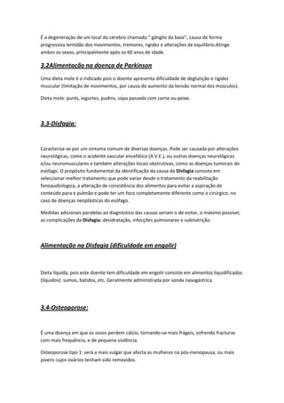 Este documento discute as doenças e restrições dietéticas comuns em idosos, incluindo Alzheimer, Parkinson, disfagia, osteoporose, obesidade, diabetes, hipertensão, colesterol alto, obstipação, insuficiência cardíaca e renal. Para cada condição, ele fornece recomendações de alimentação, como dietas moles, líquidas ou ricas em nutrientes específicos.