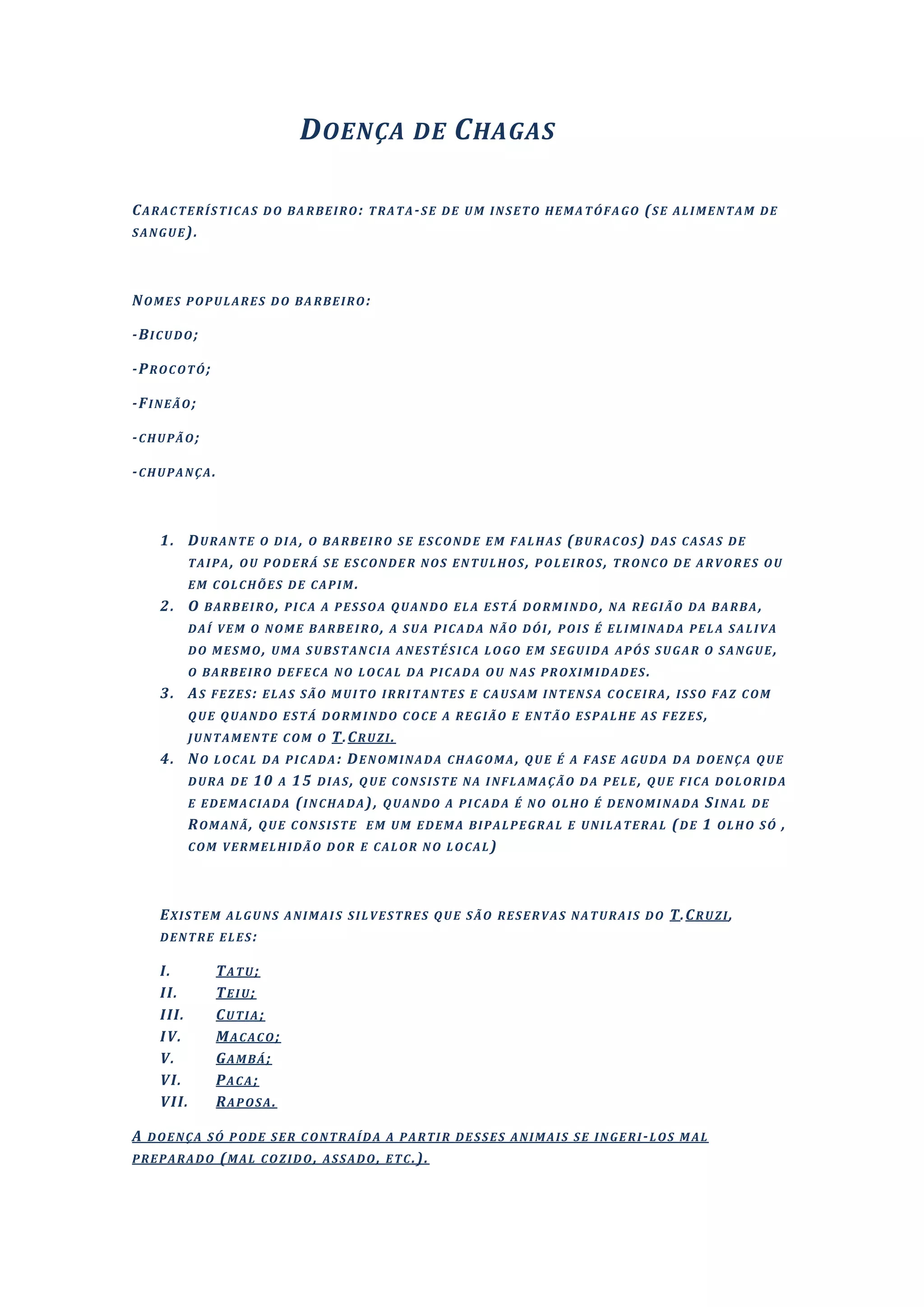 O documento descreve as características e formas de transmissão da doença de Chagas, causada pelo parasita Trypanosoma cruzi. O parasita é transmitido através das fezes do barbeiro hematófago durante o seu banquete noturno. A doença pode também ser transmitida através de transfusões sanguíneas, transplantes e da mãe para o feto durante a gravidez.