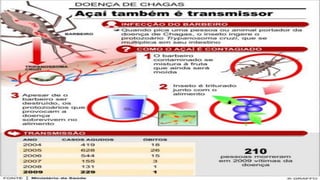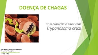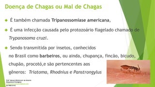 A Doença de Chagas é causada pelo protozoário Trypanosoma cruzi e transmitida principalmente por barbeiros. A fase aguda geralmente é assintomática, mas pode causar febre, inchaço nos gânglios linfáticos e órgãos. Após a fase aguda, começa uma fase crônica que pode durar décadas e causar danos ao coração ou intestino.