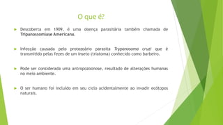 A doença de Chagas é causada pelo protozoário Trypanosoma cruzi, transmitido pelas fezes do barbeiro. Pode ser assintomática por anos ou causar sintomas agudos como febre e crônicos como comprometimento cardíaco. Não tem cura, mas o tratamento controla os sintomas. A doença atinge principalmente populações pobres da América Latina.
