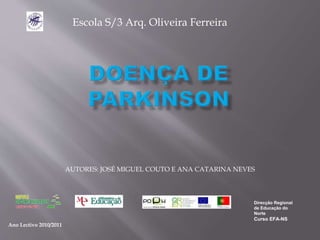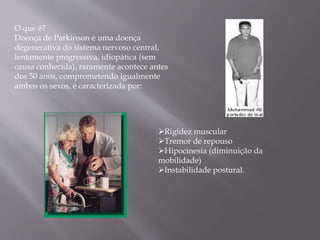 Este documento descreve a doença de Parkinson, incluindo seus sintomas, como se desenvolve, diagnóstico e tratamentos. A doença de Parkinson é causada pela perda de neurônios no cérebro que produzem a substância dopamina, levando a sintomas como tremores, rigidez e dificuldade de movimento. O tratamento envolve medicamentos, fisioterapia, psicoterapia e, em alguns casos, cirurgia para substituir a dopamina perdida e controlar os sintomas.
