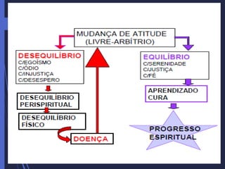 O documento discute vários aspectos relacionados à saúde mental e espiritual segundo a doutrina espírita, incluindo causas, sintomas e tratamentos de diferentes tipos de doenças como depressão, neuroses, fobias, entre outras.