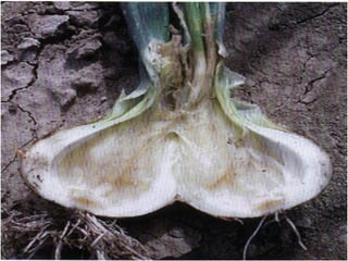 Este documento resume as principais doenças que afetam aliáceas como alho e cebola, descrevendo os sintomas, agentes causadores, epidemiologia e métodos de controle de cada doença. As doenças abordadas incluem mancha púrpura, podridão branca, ferrugem, míldio, tombamento, fusariose e podridão bacteriana da escama. O documento fornece informações técnicas detalhadas sobre cada doença para auxiliar no manejo e controle destas pragas que afetam importantes cult