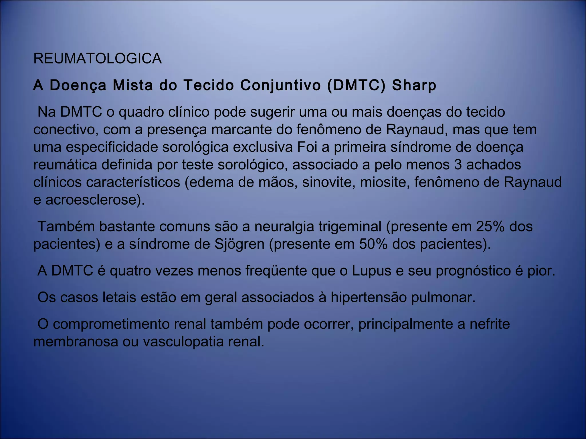 A Doença Mista do Tecido Conjuntivo (DMTC) Sharp é caracterizada pelo fenômeno de Raynaud e pelo menos 3 achados clínicos característicos. A neuralgia trigeminal e a síndrome de Sjögren são comuns. A DMTC é menos frequente que o Lupus e tem pior prognóstico, podendo levar à morte por hipertensão pulmonar ou comprometimento renal.