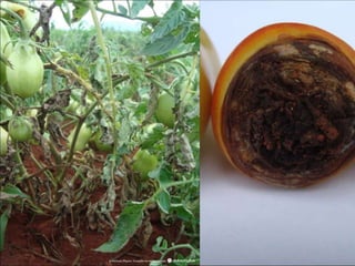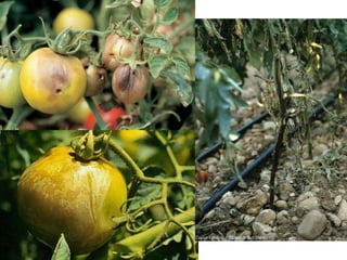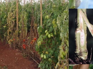 O documento discute doenças das plantas cultivadas, especificamente do tomateiro, abordando aspectos como etiologia, sintomas e métodos de controle. As principais doenças incluem murcha bacteriana, pinta preta, e murcha de fusário, que afetam severamente a produção de tomate em regiões do Brasil. O texto também menciona a importância econômica do tomate e a crescente produção, destacando Rondônia como um dos estados em destaque na produção.