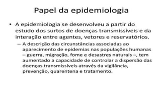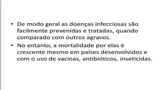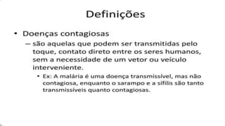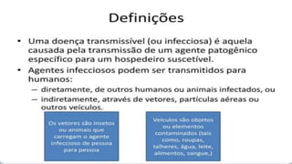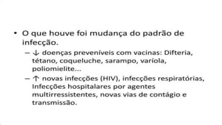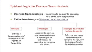 O documento discute questões sobre epidemiologia de doenças transmissíveis, incluindo a cadeia de infecção da intoxicação alimentar por Salmonella, o Regulamento Sanitário Internacional, os quatro níveis de prevenção da tuberculose e a diferença entre epidemia, endemia e pandemia. Ele também fornece um link para um vídeo sobre principais doenças infecciosas.