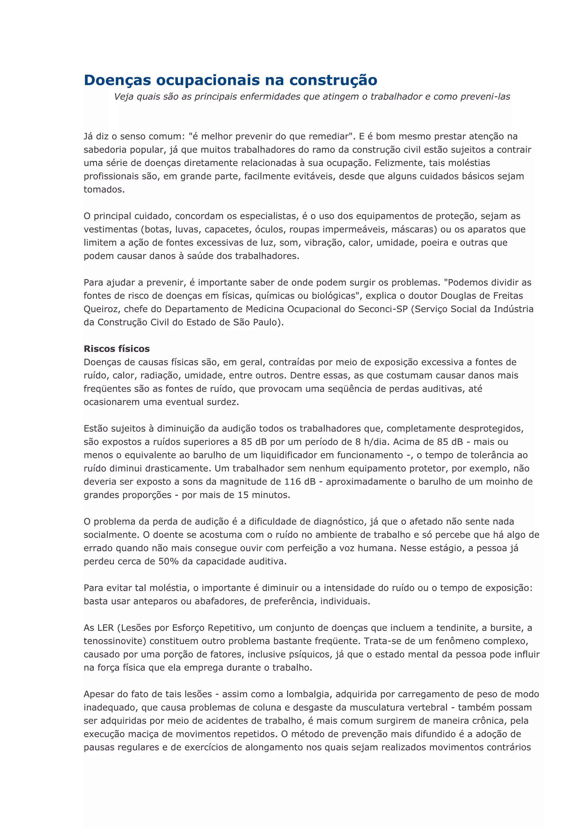 O documento discute as principais doenças ocupacionais na construção civil, incluindo perda auditiva causada por ruído excessivo, conjuntivite por exposição à radiação e LER causadas por movimentos repetitivos. Ele explica as causas, sintomas e métodos de prevenção dessas doenças, enfatizando a importância do uso de equipamentos de proteção individual.