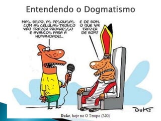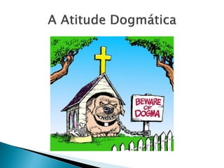 O dogmatismo pode ser entendido como: 1) A crença ingênua na possibilidade de conhecer a verdade das coisas; 2) Confiança absoluta na razão como órgão de conhecimento; 3) Submissão completa a princípios ou autoridade. A atitude dogmática é conservadora e gera preconceitos que impedem o contato com novas ideias, colocando em risco crenças já estabelecidas.