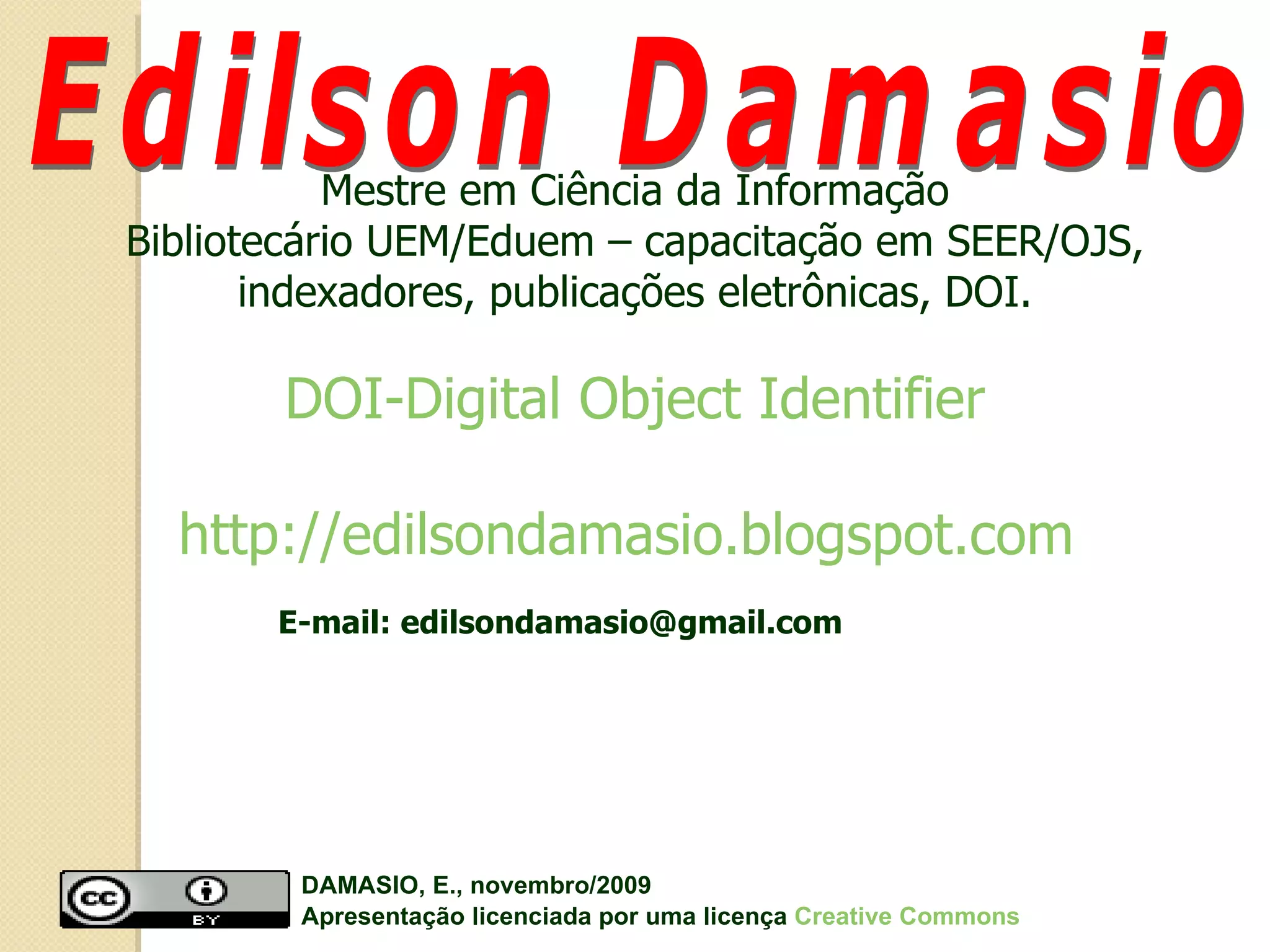 Este documento resume a experiência da Universidade Estadual de Maringá (UEM) com o sistema de publicação eletrônica SEER/OJS e a atribuição de identificadores digitais persistentes (DOI) aos seus periódicos. A UEM implantou o SEER em 2007 e migrou para a versão 2.2.2.0 em 2008, publicando atualmente 23 periódicos com 3.700 artigos e 14.000 usuários cadastrados. A UEM se associou à Publishers International Linking Association para atribuir DOIs institucionais aos seus periódicos