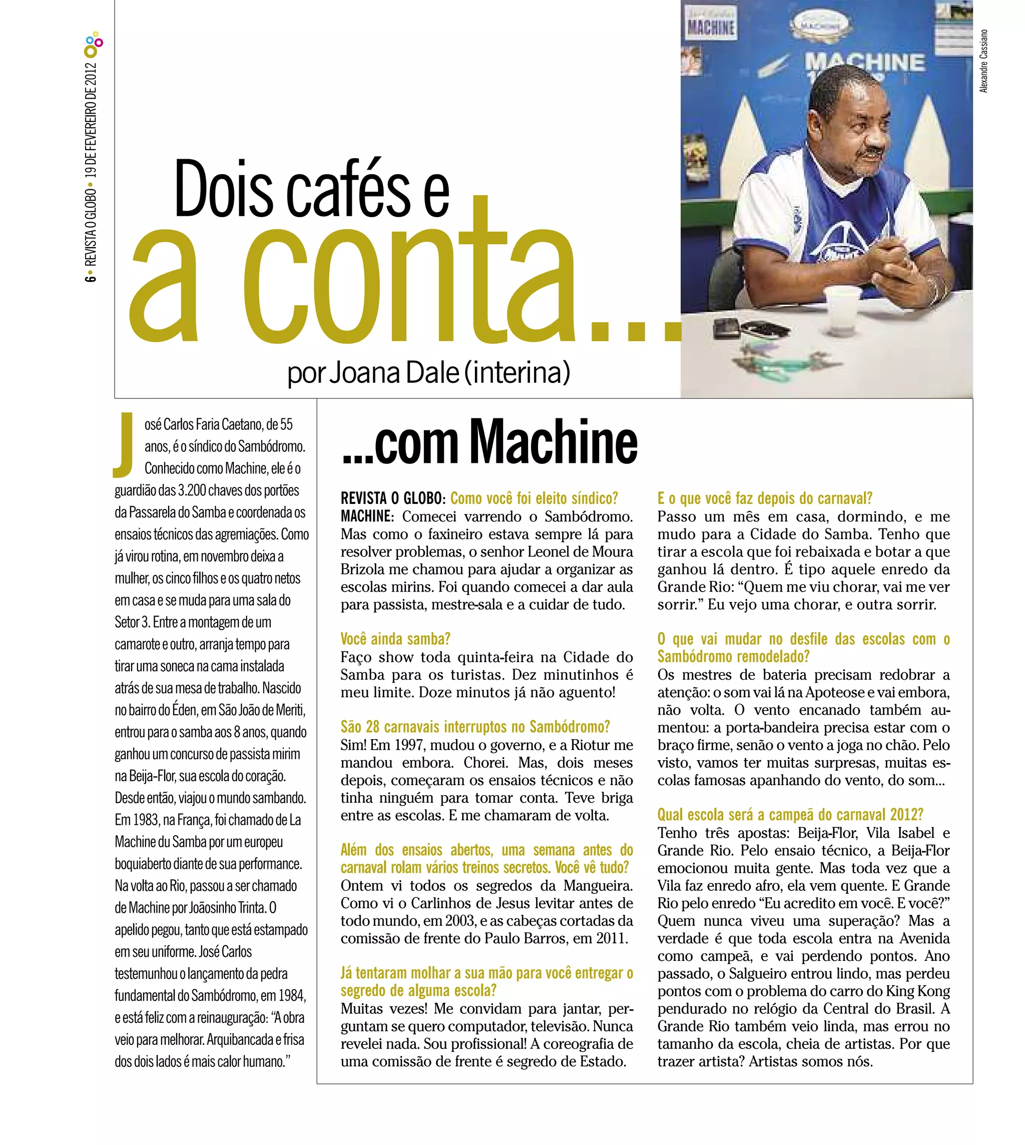 O documento descreve a entrevista com José Carlos Faria Caetano, conhecido como Machine, síndico do Sambódromo do Rio de Janeiro há 28 carnavais. Machine começou varrendo o Sambódromo e agora organiza os ensaios técnicos e coordena a montagem das arquibancadas. Ele testemunhou as mudanças no Sambódromo ao longo dos anos e acredita que as melhorias trarão surpresas para o desfile das escolas em 2012.