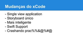 O documento discute as mudanças no Xcode 6 e no Swift, incluindo suporte para Swift, declarações de variáveis simplificadas e métodos Func(). Ele também propõe criar um projeto usando Swift com um LoginViewController para iPhone e iPad em Swift, um UIAlertViewController para erros e chamando um MainViewController de Objective-C passando um usuário via Bridge.h.