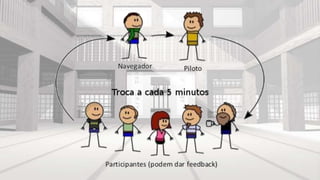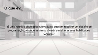 O documento descreve o que é um coding dojo, seus formatos e princípios. Um coding dojo é uma reunião onde desenvolvedores resolvem desafios de programação em grupo para se divertirem e melhorarem suas habilidades. O formato escolhido foi o Randori, onde todos participam tentando resolver um problema em pares e de forma colaborativa.