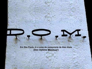 O restaurante D.O.M. de Alex Atala, localizado em São Paulo, é classificado como o 7° melhor do mundo e oferece um menu de degustação de 10 pratos ao custo de R$ 400,00 por pessoa. O cardápio inclui combinações inovadoras de ingredientes brasileiros, como gel de tomates verdes e moqueca de camarão. Além de oferecer uma experiência gastronômica única, o restaurante também serve vinhos a preços elevados e sucos exóticos.