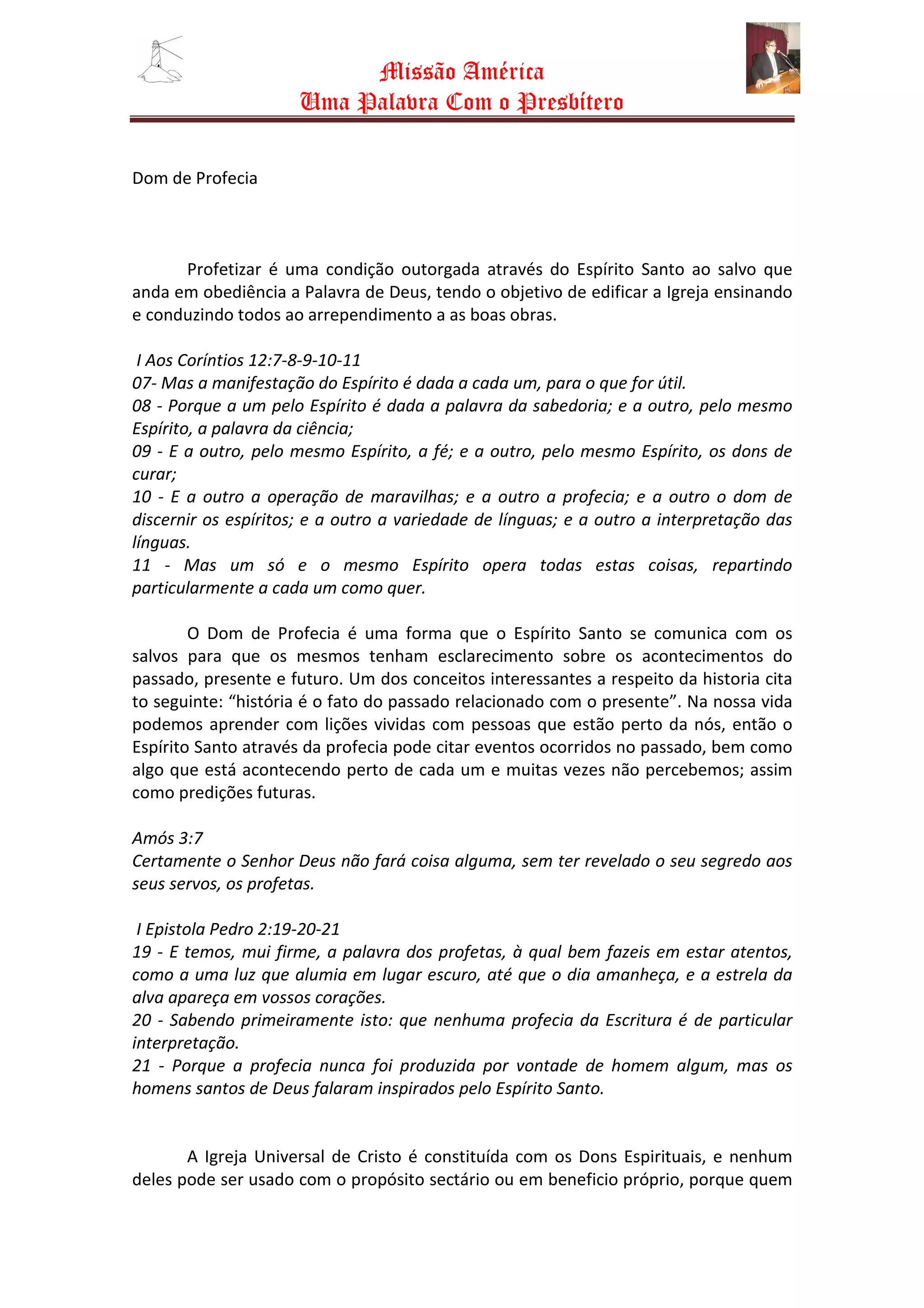 Este documento discute o dom da profecia como uma forma do Espírito Santo se comunicar com os salvos para dar esclarecimentos sobre o passado, presente e futuro. A profecia tem o objetivo de edificar a Igreja e conduzir as pessoas ao arrependimento, não para ostentação pessoal. O documento também diferencia a profecia do dom de línguas, explicando que a profecia é para os homens e o dom de línguas é para a intimidade com Deus.