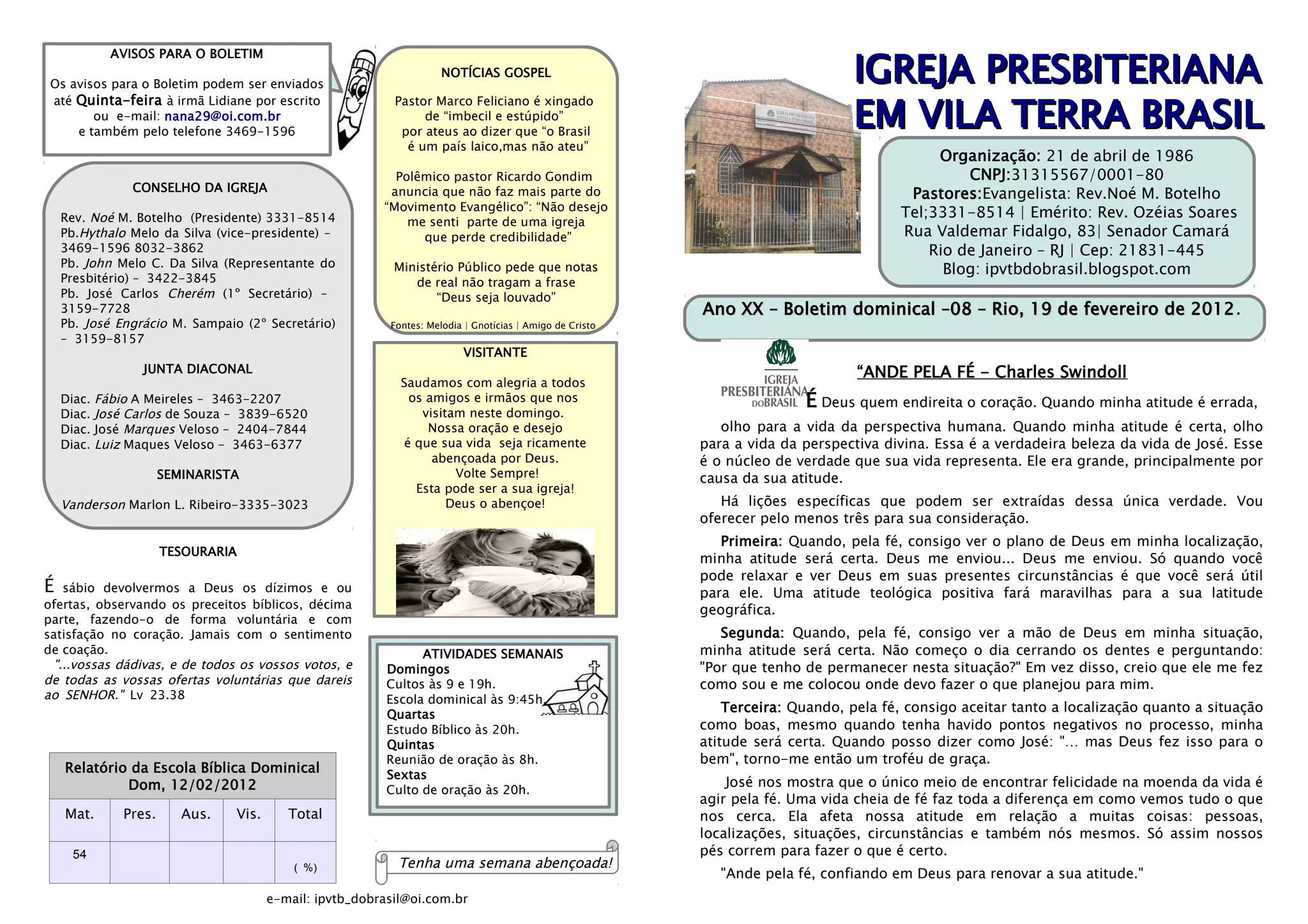 Este boletim dominical da Igreja Presbiteriana em Vila Terras Brasil contém: