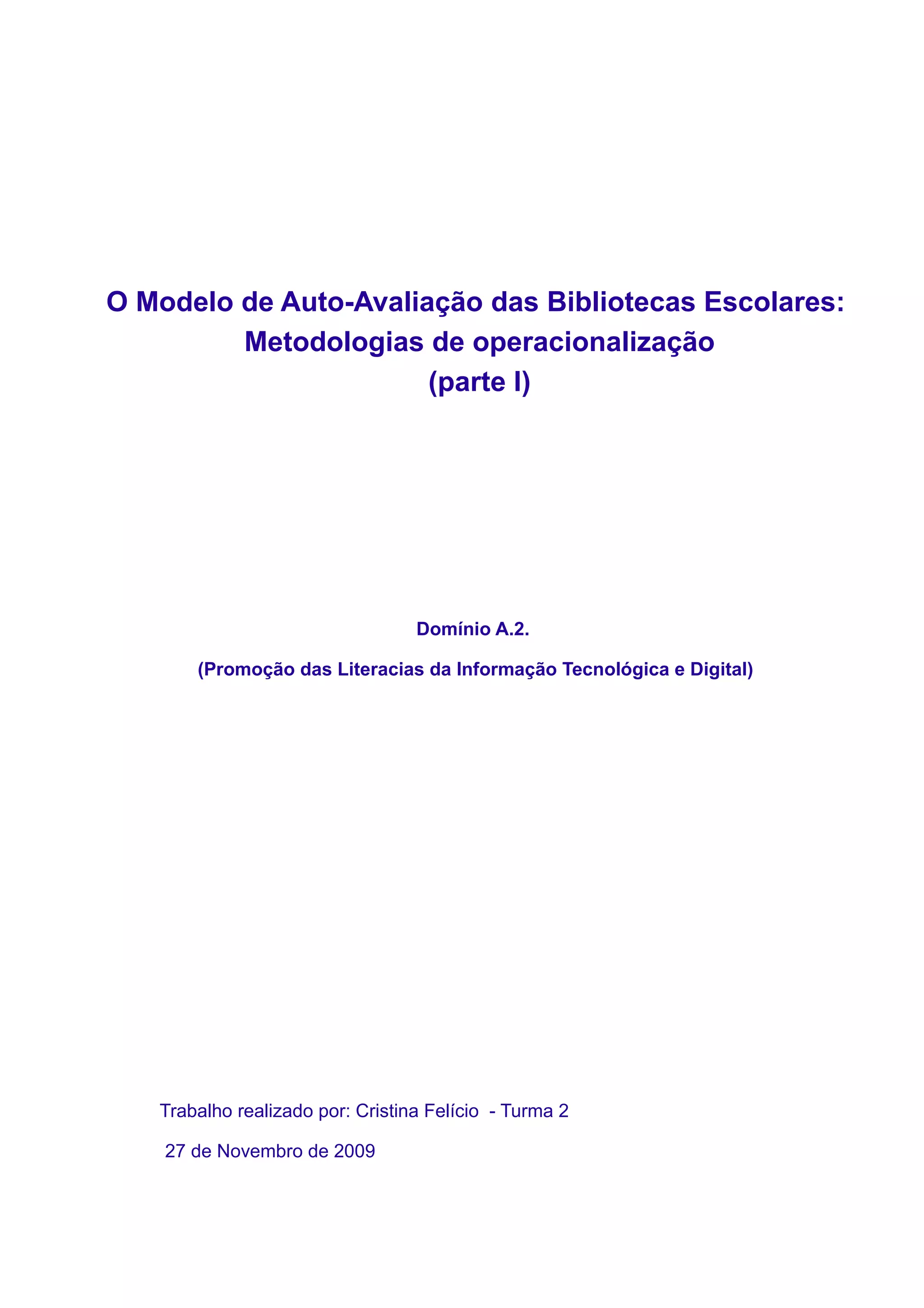Este documento descreve o processo de autoavaliação da Biblioteca Escolar da Escola D. José I em Vila Real de St. António. O documento detalha a metodologia para avaliar o domínio A.2, promoção da literacia da informação, tecnológica e digital, incluindo a organização de atividades de formação e o impacto da biblioteca no desenvolvimento de competências. O processo envolve a recolha de dados através de observações, questionários e estatísticas, para analisar o desempenho da bibli