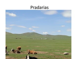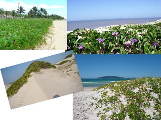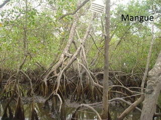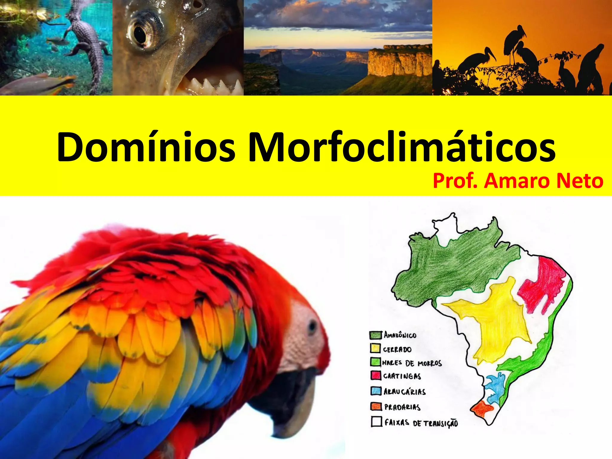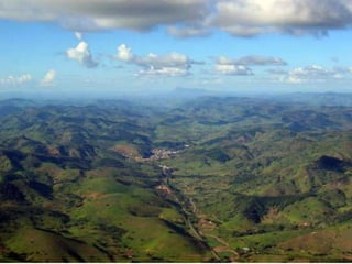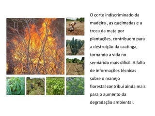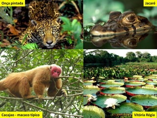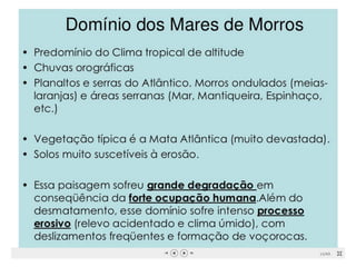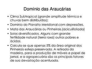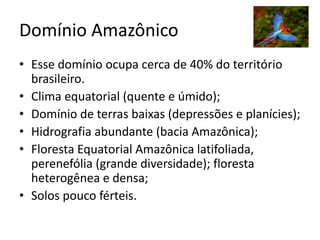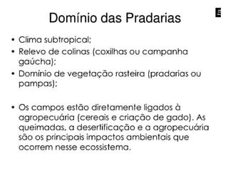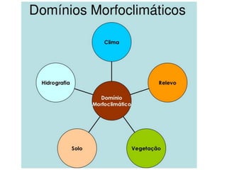 O documento descreve os principais domínios morfoclimáticos do Brasil, incluindo a Amazônia, o Cerrado, a Caatinga, os Mares e Morros, as Araucárias, as Faixas de Transição e o Pantanal. Cada domínio possui características climáticas, de relevo, vegetação e fauna únicas. O documento também discute os principais impactos humanos nesses biomas, como desmatamento, queimadas e expansão agrícola.