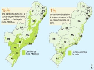 O documento lista diversos domínios morfoclimáticos do Brasil, incluindo a Zona da Mata Nordestina, a Região Sudeste e o Domínio dos Mares de Morros. A conclusão resume que a porção leste do Brasil tem relevo arredondado, Mata Atlântica, clima tropical úmido e de altitude, e atividades como agricultura, desmatamento e urbanização. O documento foi produzido por quatro alunas para um professor de 1o ano do ensino médio.