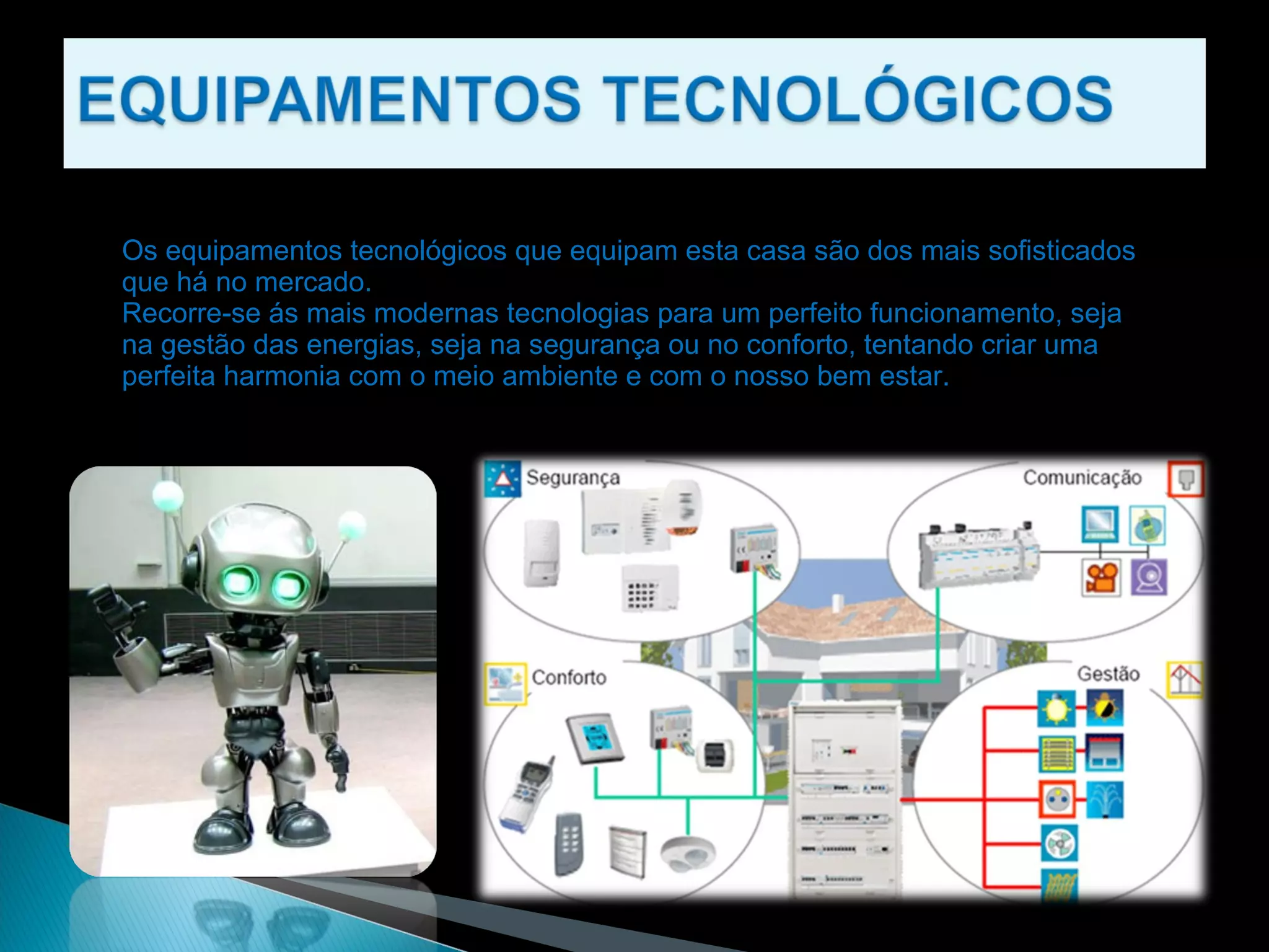 A casa possui equipamentos tecnológicos sofisticados que gerenciam a energia, segurança e conforto de forma sustentável. Os banheiros contam com sistemas de sanita e chuveiro inteligentes, e a sala tem monitores LCD que substituem obras de arte. Cada quarto também possui um monitor LCD e móveis com iluminação LED para requinte.