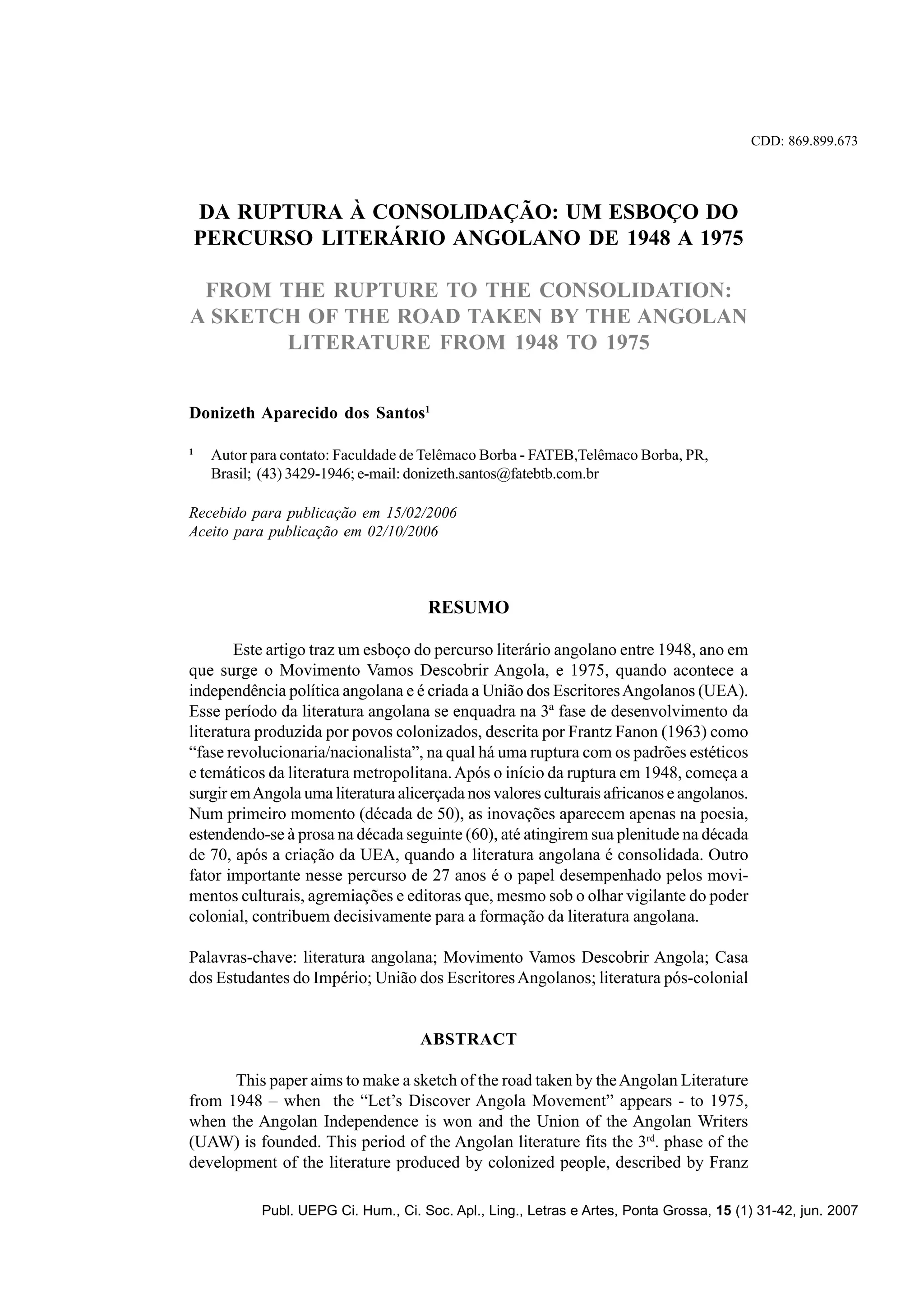 Este documento descreve a evolução da literatura angolana de 1948 a 1975, dividida em três fases: 1) A partir de 1948, com o Movimento Vamos Descobrir Angola, começa a emergir uma literatura baseada nos valores culturais angolanos, rompendo com os padrões literários coloniais; 2) Nas décadas de 1950 e 1960, as inovações aparecem primeiro na poesia e depois se estendem à prosa; 3) A partir da década de 1970 e da criação da União dos Escritores Angolanos, a literatura angol