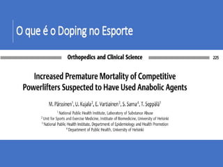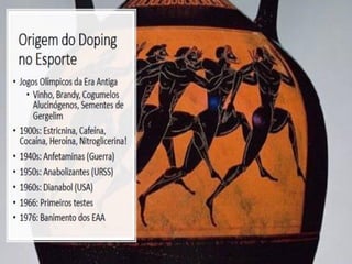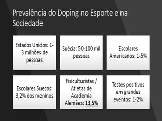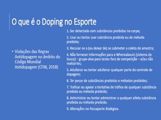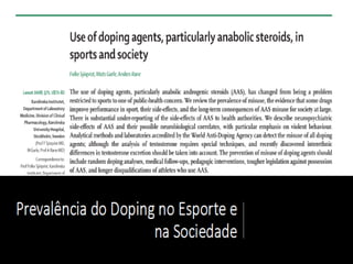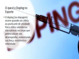 O documento discute vários métodos de doping e seus efeitos na saúde. Estes incluem estimulantes que reduzem a fadiga mas aumentam riscos cardíacos, narcóticos que mascaram dor mas causam dependência, e esteróides anabólicos que aumentam força muscular mas causam danos orgânicos. Muitos métodos de doping podem levar a danos graves ou até morte subita do atleta.