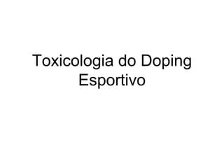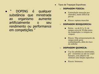 O documento discute as várias formas de doping no esporte, incluindo dopagem física, bioquímica, química e genética. Também aborda os riscos à saúde dessas práticas e os métodos de detecção de dopagem, como cromatografia gasosa e espectrometria de massa.