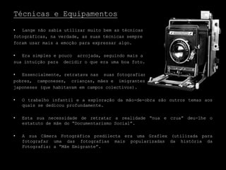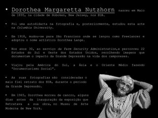Dorothea Lange foi uma fotógrafa norte-americana autodidata que documentou os efeitos da Grande Depressão nos Estados Unidos através de fotografias para a Farm Security Administration entre 1930-1940. Suas fotografias retratando pobres, camponeses e imigrantes a estabeleceram como pioneira do "documentarismo social" e sua fotografia "Migrant Mother" se tornou uma das imagens mais icônicas da história. Ela continuou a viajar e fotografar até sua morte em 1965.