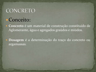 O documento discute os conceitos e propriedades do concreto, incluindo sua composição, dosagem, resistência e produção. O concreto é uma mistura de agregados, areia, cimento e água que deve ser trabalhável quando fresco e resistente quando endurecido. A resistência característica do concreto (fck) é um parâmetro importante para o projeto estrutural e normalmente deve ser de no mínimo 20 MPa.