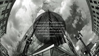 O documento descreve a história de consolidação de uma empresa brasileira de soluções digitais que começou em 1996 e hoje atua em 8 áreas diferentes de negócios digitais como educação a distância, comércio eletrônico e marketing político digital, atuando em parceria com grandes empresas globais.