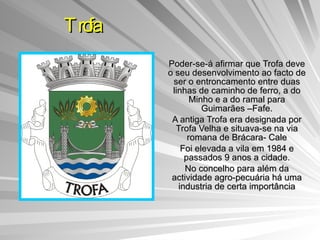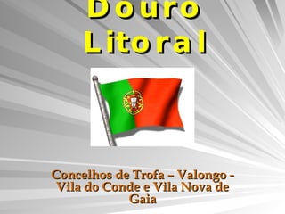 Este documento descreve brevemente 5 concelhos da região do Douro Litoral: Trofa, Valongo, Vila do Conde e Vila Nova de Gaia. Trofa desenvolveu-se ao redor de linhas ferroviárias e tem atividades agrícolas e industriais. Valongo tem raízes antigas e é centro produtor e industrial. Vila do Conde tem uma longa história ligada à pesca e sal e é importante porto pesqueiro. Vila Nova de Gaia fica frente ao Porto e é conhecida pelas caves de vinho do