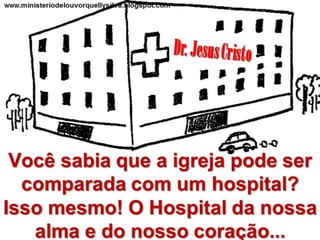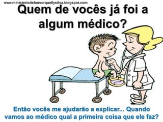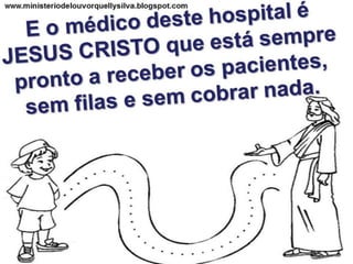 O documento discute como Jesus veio para curar os pecadores e como podemos melhorar nossa relação com Deus. Ele analisa como nossas bocas, ouvidos, pressão e corações precisam de cura espiritual, oferecendo remédios como fé, humildade e o sangue de Jesus.