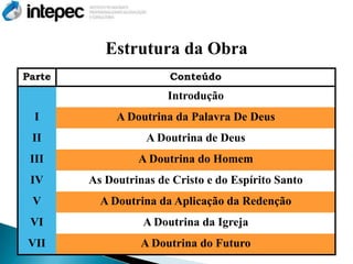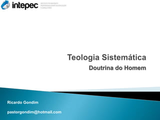 Este documento apresenta a doutrina do homem de acordo com a perspectiva bíblica. Ele discute a criação do homem, sua natureza e propósito, o pecado original e suas consequências, e as alianças que Deus estabeleceu com a humanidade ao longo da história da salvação.