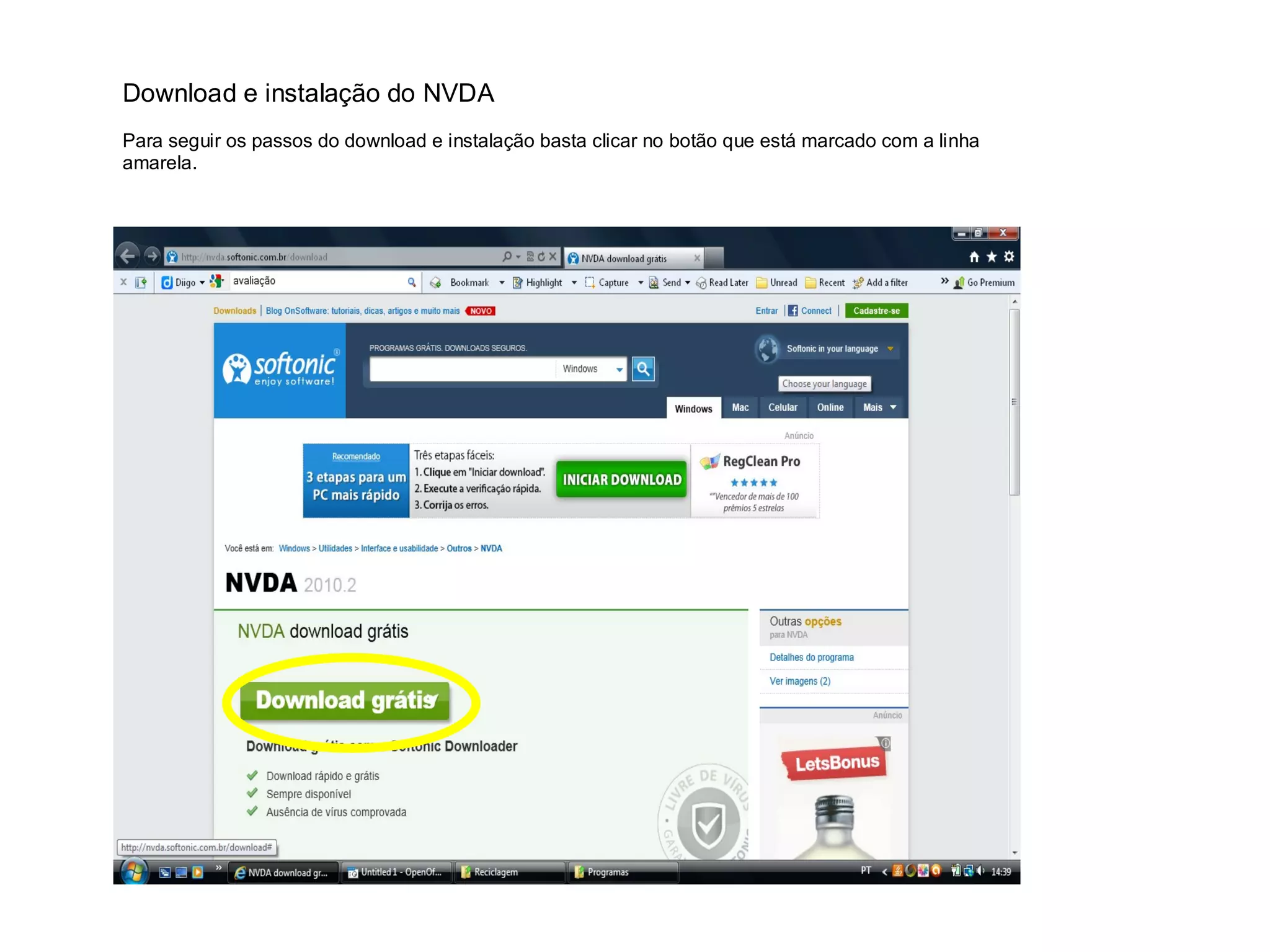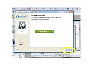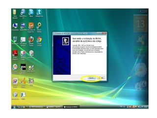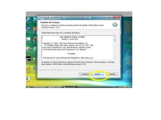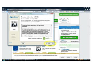 O documento fornece instruções passo-a-passo para baixar e instalar o software de leitor de tela NVDA, incluindo clicar em botões específicos, escolher opções de instalação, e configurar preferências de acessibilidade após a instalação.