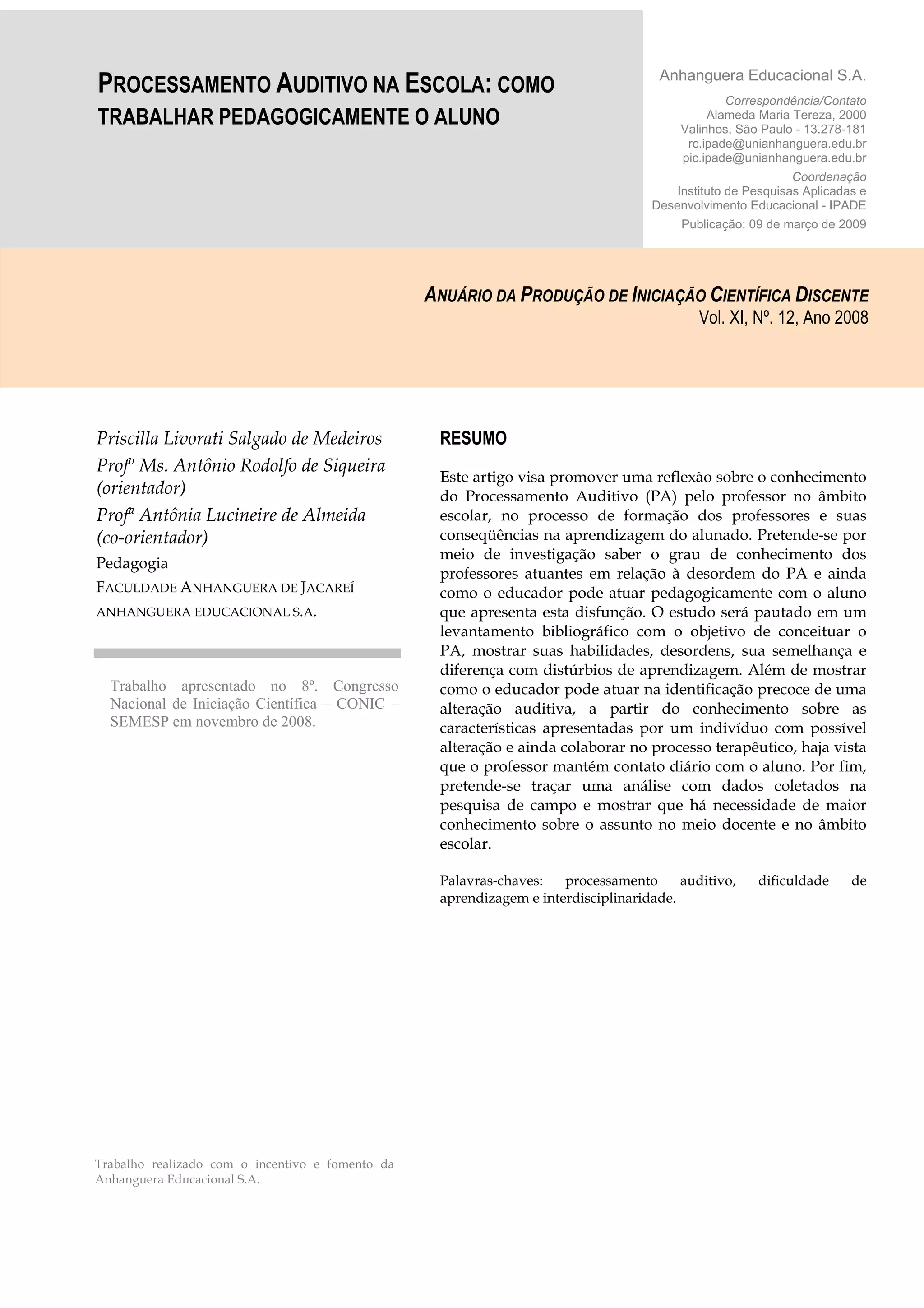 Este documento discute o Processamento Auditivo (PA) no contexto escolar e a necessidade de os professores terem maior conhecimento sobre o assunto. O documento apresenta o conceito de PA e sua importância no desenvolvimento humano, além de descrever as principais habilidades auditivas. Finalmente, destaca que é importante os professores entenderem o PA para melhor identificarem e apoiarem alunos com possíveis problemas auditivos.