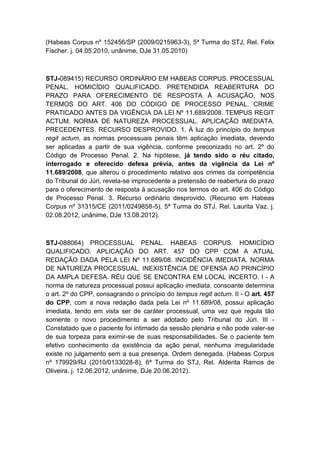 Este documento apresenta resumos de três decisões do Superior Tribunal de Justiça sobre a aplicação imediata de normas processuais penais de acordo com o princípio do tempus regit actum constante no artigo 2o do Código de Processo Penal. As decisões tratam da aplicação das alterações dos artigos 420, 457 e 400 do CPP introduzidas pela Lei 11.689/2008.