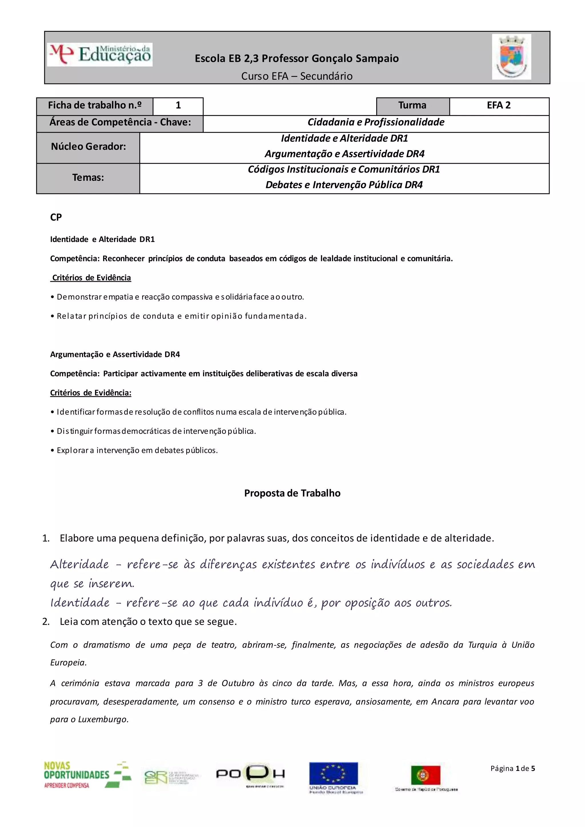 Este documento apresenta uma proposta de trabalho para estudantes sobre a identidade e alteridade no contexto da adesão da Turquia à União Europeia. A proposta inclui definir esses conceitos, ler um texto sobre as negociações de adesão e os desafios que coloca, e discutir a posição sobre a entrada da Turquia na UE considerando informações sobre a história e cultura turca.