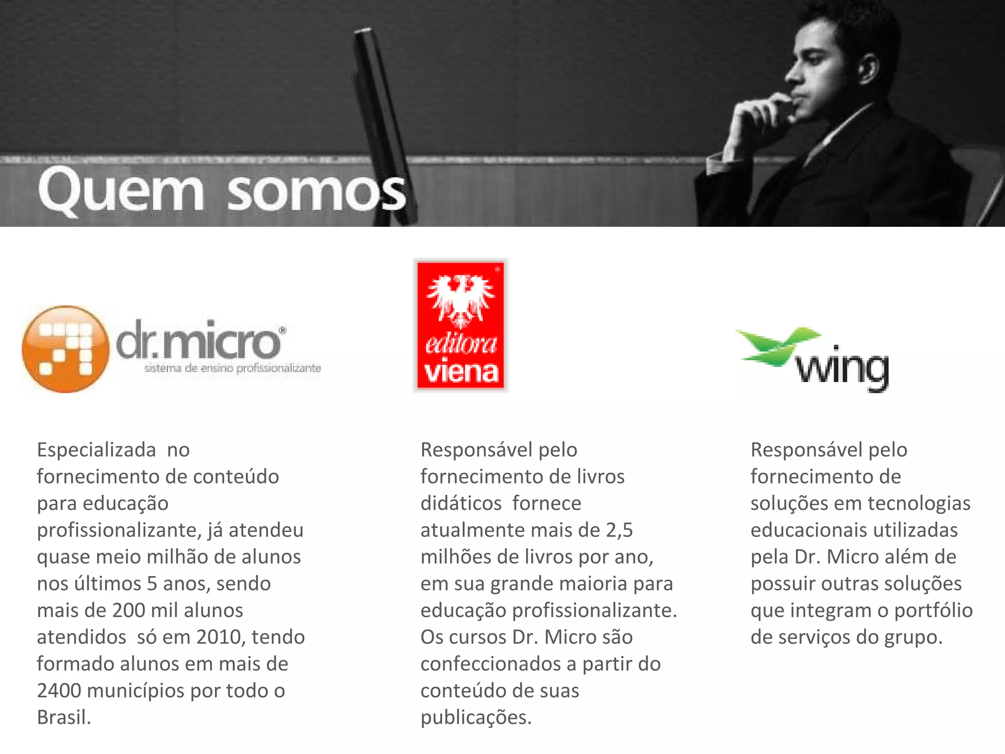 Especializada na educação profissionalizante, já atendeu quase meio milhão de alunos nos últimos 5 anos e fornece mais de 2,5 milhões de livros didáticos por ano. Oferece soluções completas para projetos de inclusão digital e cursos profissionalizantes. O VEJAMEUCURRÍCULO é uma solução online que permite aos usuários criarem currículos personalizados e se candidatarem a vagas, enquanto parceiros podem divulgar oportunidades de emprego.